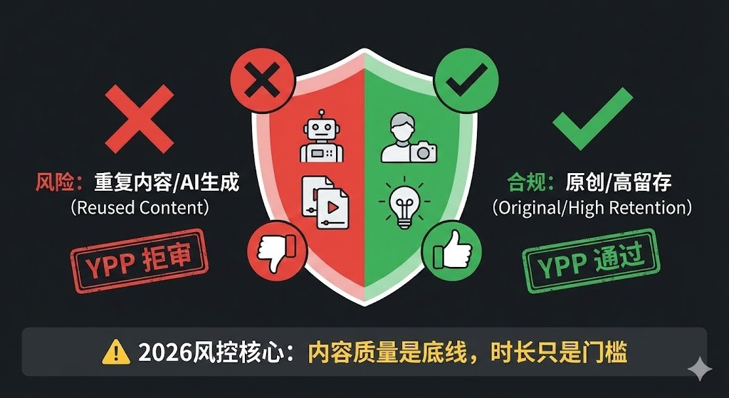 - 📌内容是底线:如果你的视频是采集或纯AI生成,买满4000小时依然无法过审(Reused Content)。