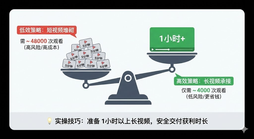 - 📌长视频优势:准备1小时以上的视频素材,可以大幅降低购买成本并提高安全性。