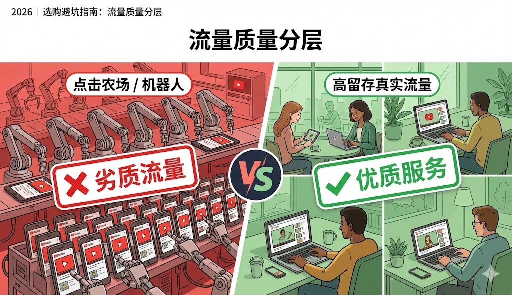 早期的算法看重的是点击率 (CTR) 和观看次数。只要有人点进来,就算一次有效观看。但在 2026 年,保留(用户留存)成为了绝对的王者。如果你的视频买了 10000 次观看,但平均观看时间长只有 10(对于一个 5)分钟的视频),算法会立即判定内容质量极差,或者流量来源异常。这种操作不但无法带来自然推荐,反而会把你的视频打入冷宫。