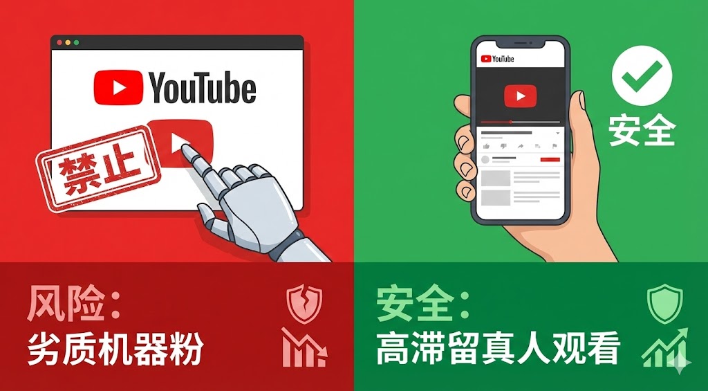 今天有大量号称“$5买10000个播放”的服务,这些通常是频道杀手。在2026年,如果你还在使用这种低劣服务,你的频道可能离封号不远了。